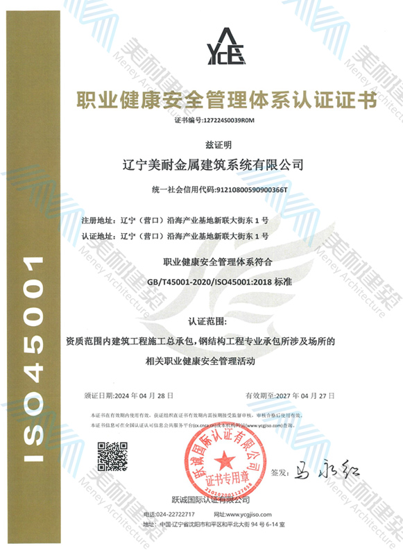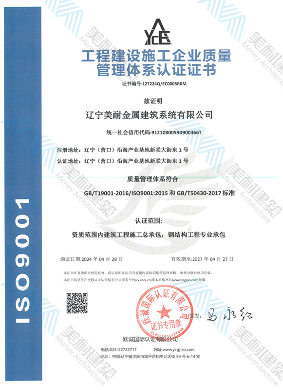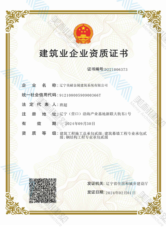 遼寧美耐金屬建筑系統(tǒng)有限公司位于遼寧(營口)沿海產(chǎn)業(yè)基地,專注于預制金屬建筑系統(tǒng)領(lǐng)域,是一家集工業(yè)建筑設(shè)計、制作、施工及相關(guān)的技術(shù)咨詢與服務為一體的綜合性服務企業(yè)。作為國家鋼結(jié)構(gòu)協(xié)會會員、中國建筑金屬結(jié)構(gòu)協(xié)會會員單位與國家高新技術(shù)企業(yè),美耐建筑集建筑工程施工總承包、鋼結(jié)構(gòu)工程專業(yè)承包等多種資質(zhì)于一身,并擁有22項鋼結(jié)構(gòu)建筑領(lǐng)域?qū)@?項軟件著作權(quán)。